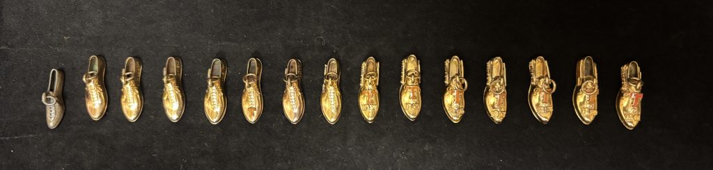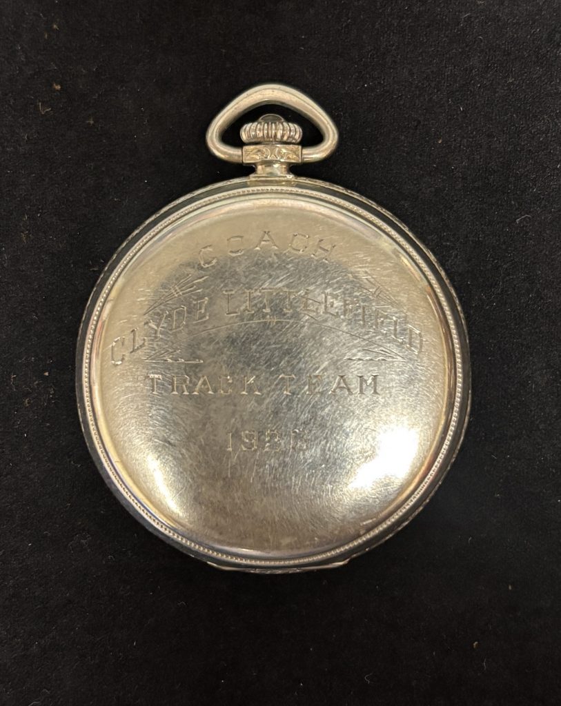 That reflection brings me back to the Clyde Littlefield charm bracelet in our display case and to the new additions we received yesterday, on the eve of the relays. A gentleman who was close to Clyde Littlefield’s son, Clyde Rabb Littlefield, brought us a collection of beautiful gold track spike charms that once belonged to Littlefield himself. Each charm, engraved with its respective year, represents a Southwest Conference championship. Some were even marked “CL-Coach.” Alongside them, we received Littlefield’s engraved pocket watch from 1926, one hundred years old this year. These mementos are more than artifacts. They are tangible reminders of a legacy that continues to shape Texas Athletics, linking generations of competitors through achievement, tradition, and pride.